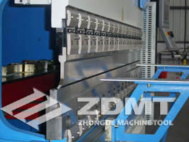 本系列液壓折彎機是雙缸上動式的數(shù)控液壓折彎機,它通過伺服比例閥上的各類閥門動作來驅(qū)動左右油缸的伸長與返回,從而帶動滑塊的上升與下降?;瑝K的同步采用全閉環(huán)電液伺服控制技術(shù),滑塊位置信號由兩側(cè)光柵尺反饋給數(shù)控系統(tǒng),再由數(shù)控系統(tǒng)控制同步閥的開口大小,自動調(diào)節(jié)油缸進油量的多少,從而控制滑塊(Y1、Y2)軸的同步運行,始終保持對工作臺的平行狀態(tài)。