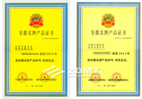 2012年3月22日,馬鞍山市召開了全市質(zhì)量技術(shù)監(jiān)督工作會(huì)議,會(huì)議對(duì)2011年獲得質(zhì)監(jiān)部門相關(guān)榮譽(yù)的企業(yè)與個(gè)人進(jìn)行了表彰,我公司中德牌液壓擺式剪板機(jī)和中德牌液壓板料折彎?rùn)C(jī)兩個(gè)產(chǎn)品分別通過了2011年“安徽名牌”的復(fù)審。